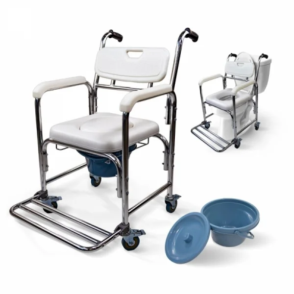 Combina movilidad (ruedas con freno), versatilidad (uso sobre inodoro o con cubeta), ligereza para facilitar transferencias y diseño robusto para entorno doméstico. Ideal cuando se necesita trasladar al usuario entre habitación y baño.