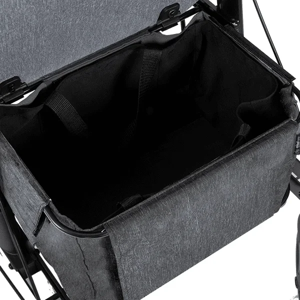 La cesta plegable está unida al asiento mediante una cremallera. Al abatir el asiento, se despliega en una doble cesta de gran capacidad, similar a un carro de compra convencional. Además, se fija con un clip al respaldo para mayor estabilidad. Es extraíble y lavable, lo que facilita enormemente su mantenimiento.