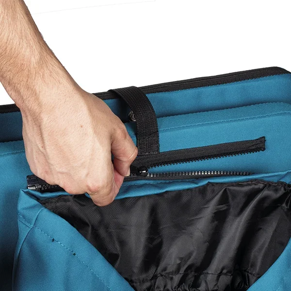Está disponible en dos colores de tejido: gris y turquesa, ambos sobre chasis negro mate. El plegado se realiza mediante ruedas abatibles con pomos de rápida extracción, sin herramientas. Las dimensiones plegado son 55 x 65 x 42 cm, lo que permite guardarlo en el maletero de un coche o en un armario.
