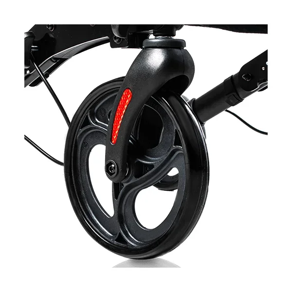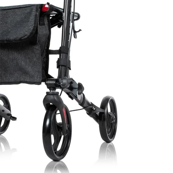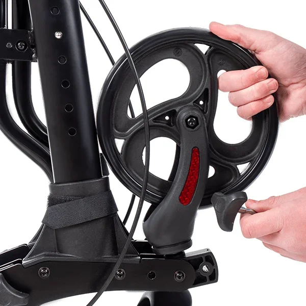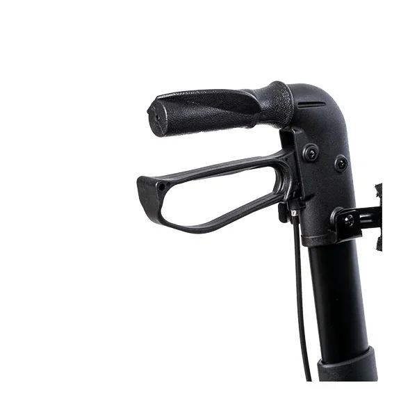 Las cuatro ruedas macizas de Ø 19,5 cm —tanto delanteras como traseras— están diseñadas para superficies irregulares: adoquines, caminos de tierra, rampas o bordillos. Al ser macizas, no pinchan ni requieren mantenimiento. Por otro lado, el freno tipo maneta ofrece un control preciso de la velocidad y permite detener el rollator de forma segura en pendientes, algo que los frenos de palanca convencionales no siempre garantizan con igual eficacia.Especificaciones técnicas