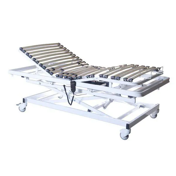 Somier eléctrico articulado, de 4 planos con 3 articulaciones, con carro elevador, 2 orificios para soportes que permiten añadir las distintas opciones de porta-sueros e incorporador, lamas de haya vaporizadas, con refuerzos de doble lamas, regulable en zona fija, base con 4 ruedas metálicas, sintéticas o con frenos simultáneos . Motor alemán de máxima garantía con batería de seguridad, para que en el caso de que haya un corte de luz, pueda volver a su posición normal; Con mando para controlar las distintas posiciones de la cama , subir o bajar a la altura deseada.