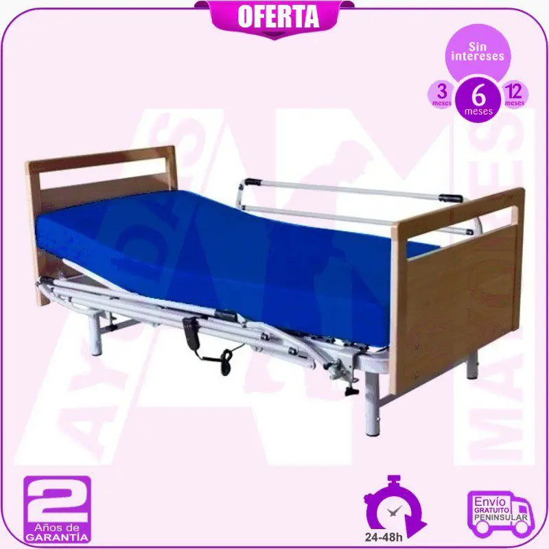 Somier eléctrico, cabecero y piecero con marco de madera, con patas regulables, fijas o con ruedas, barandillas abatibles en termo-epoxi blanco y colchón de espuma de poliuretano Visco Sanitario con funda impermeable y transpirable, anti-bacterias e ignifugo.