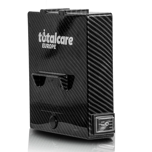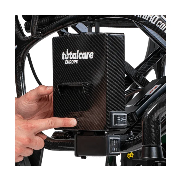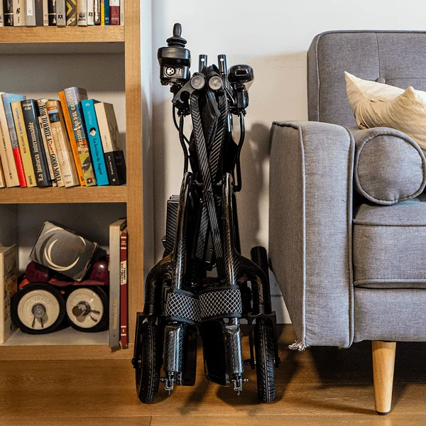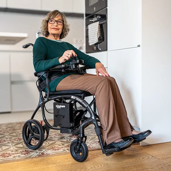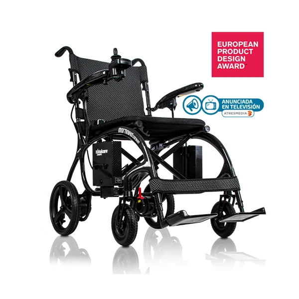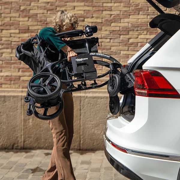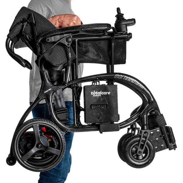Silla de ruedas eléctrica plegable Martinika Carbon de TotalCare, fabricada en fibra de carbono con un peso de solo 11,9 kg sin batería y capacidad para 150 kg. Sus dos motores de 150 W, la autonomía de hasta 35 km con doble batería y su plegado en 28 cm de ancho la convierten en la silla ultraligera más compacta del mercado. Certificada CE y galardonada en los European Product Design Awards.